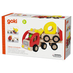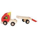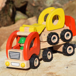 Crafted from premium, child-safe solid wood, this durable toy combination features a red truck with a detachable trailer and a yellow front-end loader. The truck's cab houses a charming green figurine, adding a playful touch to construction scenarios.